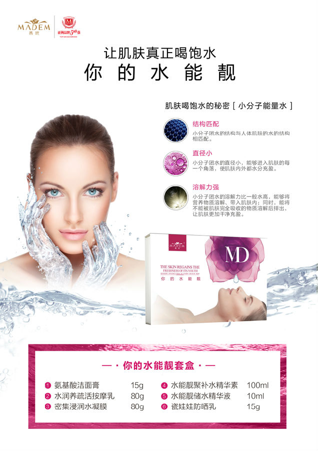 2、直径小:小分子团水的直径小,能够进入肌肤的每一个角落,使肌肤内外都水分充盈;