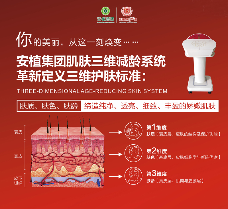 三维立体美肤仪,从肤质、肤色、肤龄三方面改变肌肤状态。去美容院配合专业线护肤产品一起使用,不仅可以强化产品的功效,还能更好的达到理想的肌肤状态。将产品精粹与仪器作用完美结合,从表皮层到达真皮层,深入到基底层,有效提升护理效果。准确瞄准肌肤的每一个问题,不遗留任何一个细节,具有治肤、护肤、美肤三重功效,使肌肤呈现全方面的立体美。有针对性的解决皮肤的肤色、水分、油分、弹性度、肤质等多个问题。