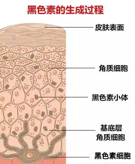 在黑色素的形成过程中,「酪氨酸酶」与「酪氨酸」这两大角色,占据了至关重要的主导地位。而酪氨酸酶会将大量的酪氨酸转化成黑色素,最终这些携带大量黑色素的黑素小体,会通过黑素细胞树突状结构,转运到附近的角质形成细胞中,这就是整个肤色变化的大致过程。