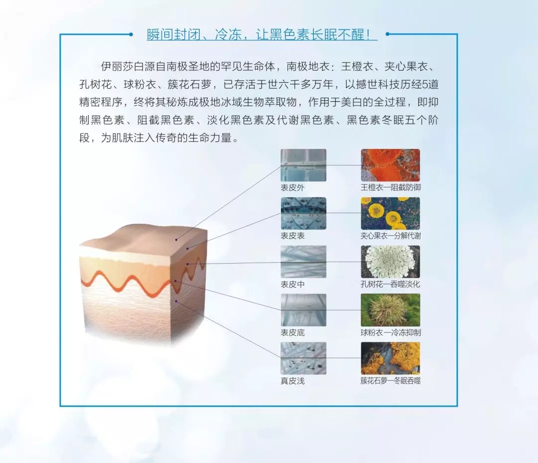 并以分子形式释放精华融于肌肤,冰封黑色素,使黑色素长眠于真皮层,令活跃的黑色素细胞长期处于冰封冷冻状态,做到从源头抑制黑色素生成。