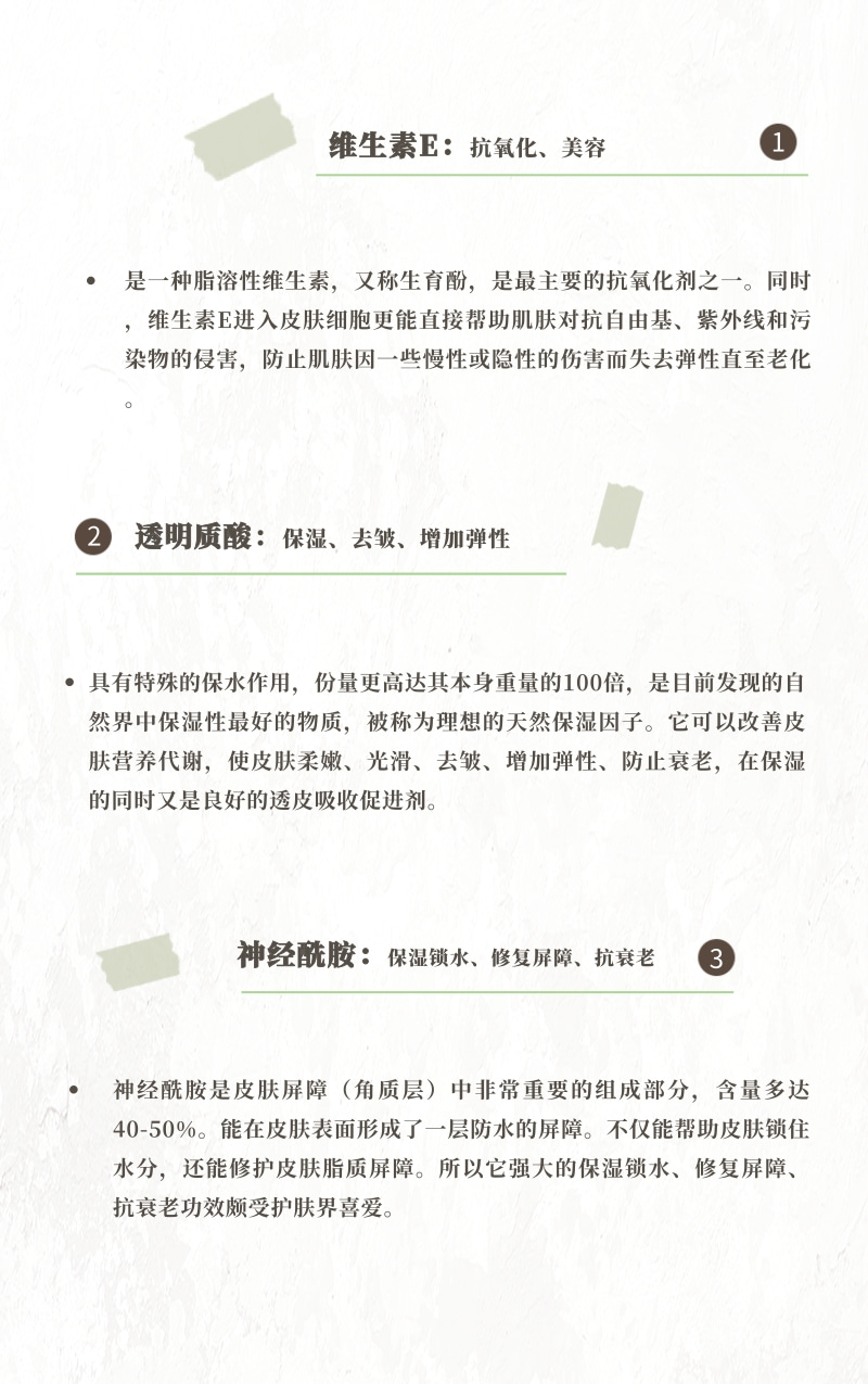 可见没一个成分都是改善受损熬夜肌的扛把子,采用这三大明星成分,经过科学配比,高浓度的精华浓缩,能高效补水、锁水、改善肌肤细纹,使肌肤充满水润弹力,散发年轻光彩~