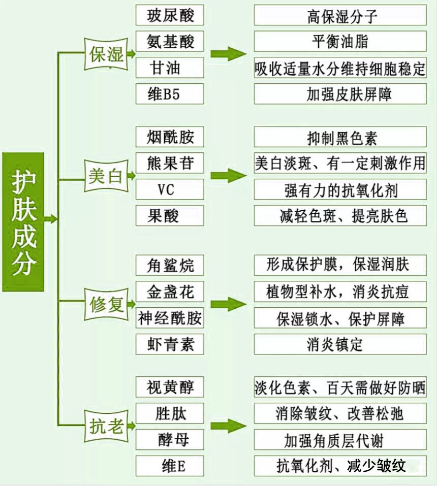 好啦,知道自己属于哪种肤质后,我们来了解一下水乳产品的主要成分有哪些: