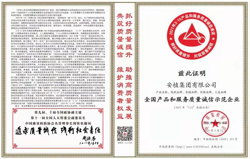 又到一年3.15国际消费者权益日,节日的设定是为了扩大消费者权益保护的宣传。在今年的3.15主题活动中,安植集团荣获了由中国质量检验协会颁布的“3.15”全国产品和服务质量诚信示范企业、全国质量检验稳定合格产品、全国质量诚信优秀企业、全国化妆品行业质量领先品牌共四项大奖。