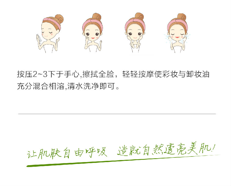 • 用法:取3〜5ml轻轻按摩整个面部,使之与彩妆充分混合相溶,再以清水洗净。