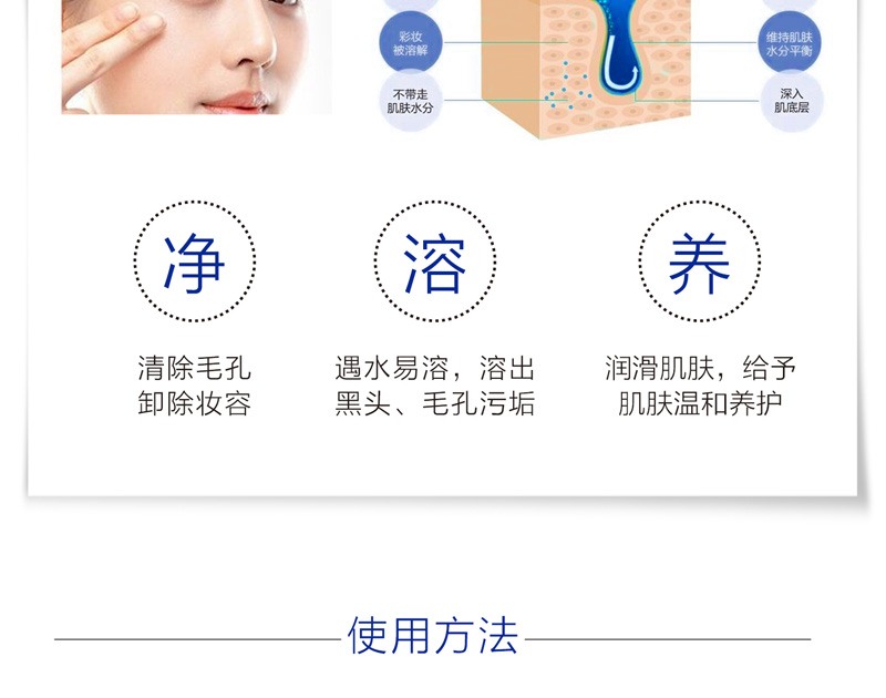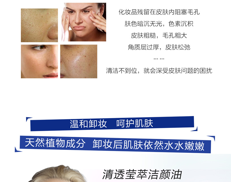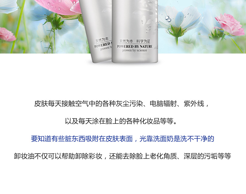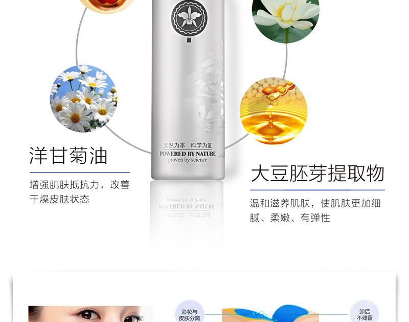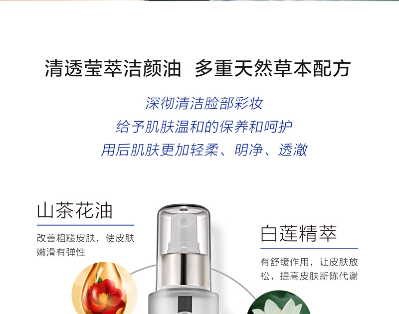 • 功效:三重天然草本配方,深澈清洁脸部彩妆,给予肌肤温和的保养呵护,使用后肌肤轻柔、明净、透澈