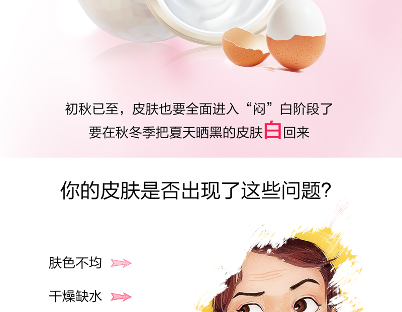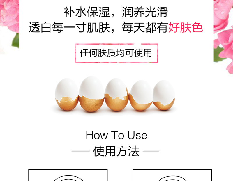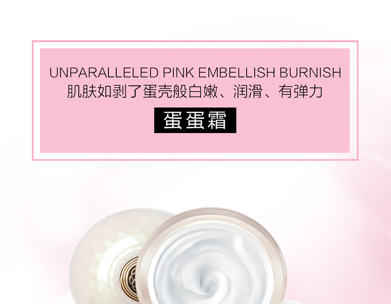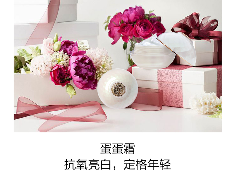 • 功效:质感如剥了壳的蛋白般滑、嫩、弹; 修护肤色不均、改善粗糙、细纹、干燥的肌肤,同时快速补水锁水; 提高肌肤的水润度与净透度,保持每个肌理如饱含浓稠滋润般的弹力和水润; 持续使用肌肤如初生儿般吹弹可破,晶莹剔透,缔造由内而外的“光透”无瑕质感。