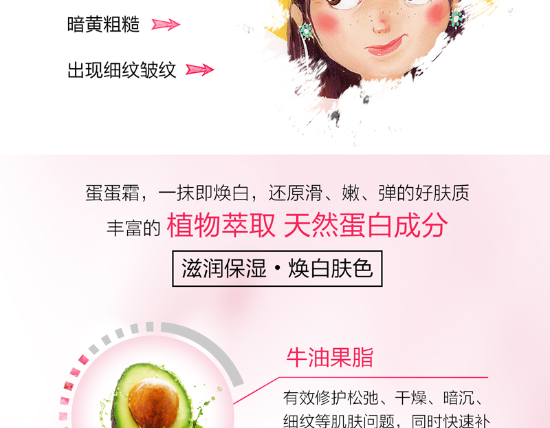 • 成分:牛油果脂、桑根提取物、大豆蛋白、胶原蛋白、天然蚕丝蛋白、维生素E、透明质酸