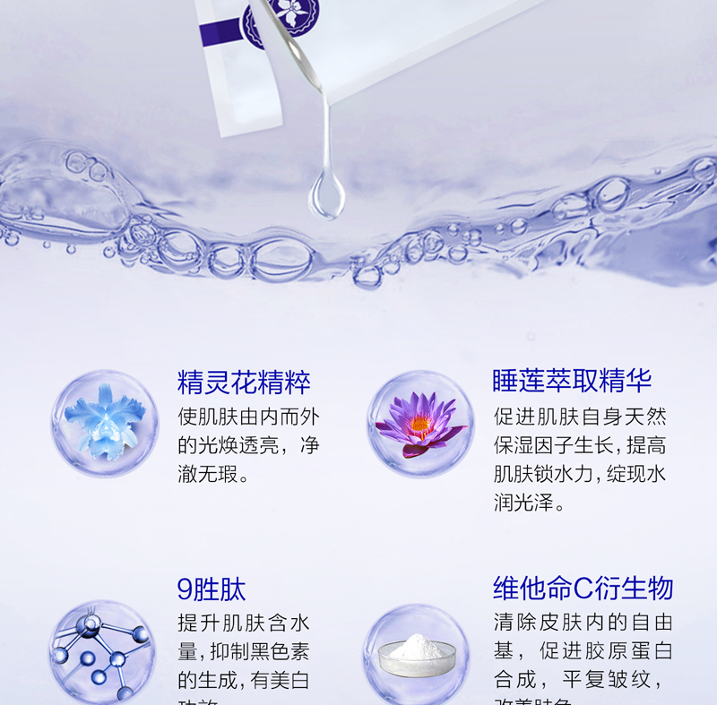 • 成分:精灵花精粹、黄芩花精粹、睡莲萃取精华、9胜肽、维他命C衍生物