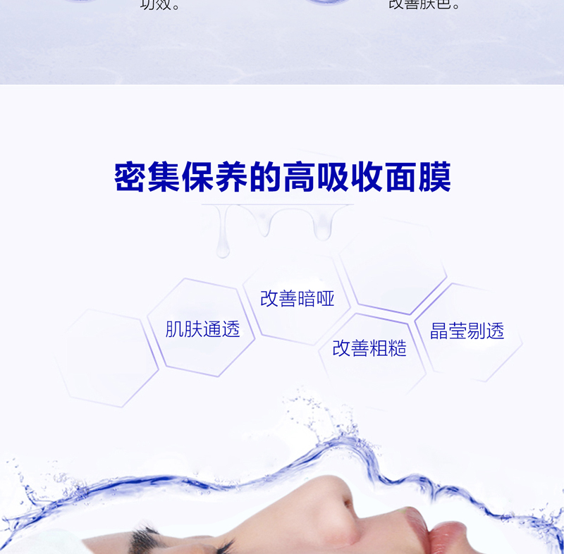 • 功效:密集保养的高吸收面膜,改善粗糙,有效提升肌肤通透感,改善黯哑,更趋晶莹剔透