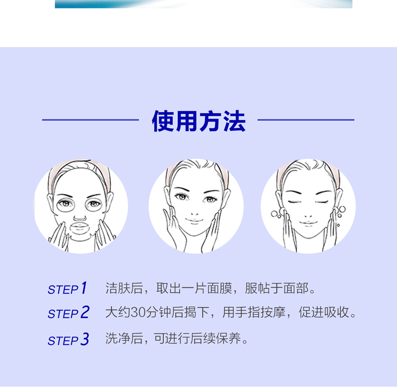 • 用法:洁肤后,取出一片面贴膜,服贴贴于面部,30分钟后揭下洗净,再进行后续保养。使用周期:4-6天使用一次,每次使用1片。