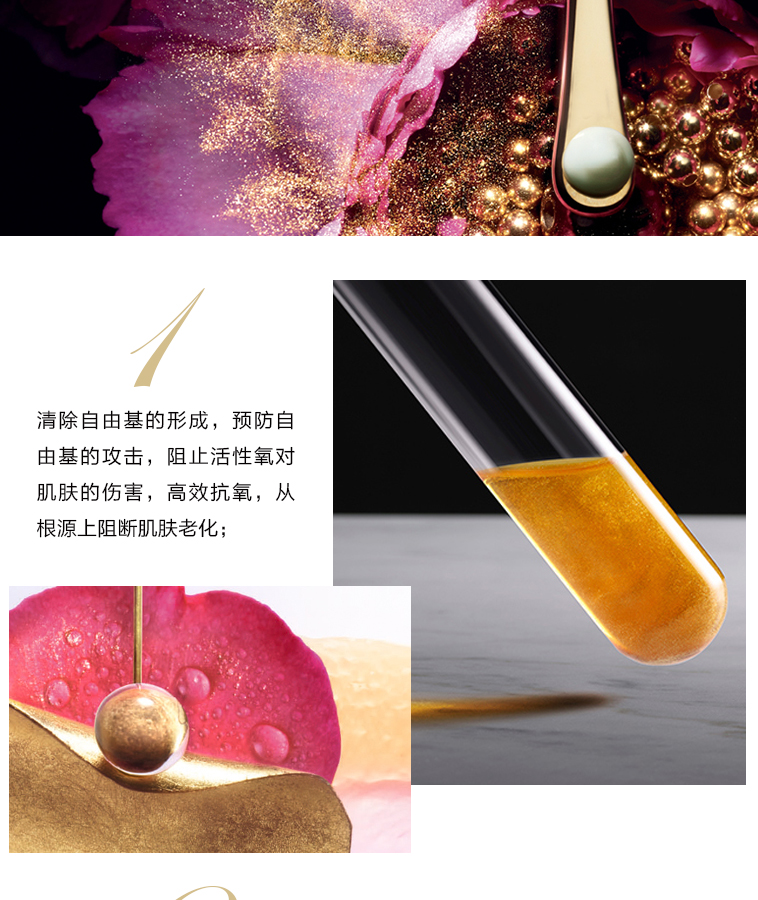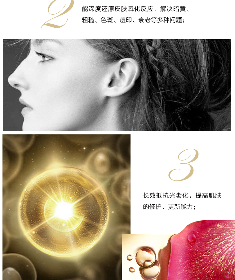 • 功效:1、清除自由基的形成,预防自由基的攻击,阻止活性氧对肌肤的伤害,高效抗氧,从根源上阻断肌肤老化; 2、能深度还原皮肤氧化反应,解决暗黄、粗糙、色斑、痘印、衰老等多种问题; 3、长效抵抗光老化,提高肌肤的修护、更新能力; 4、显著提亮肤色,紧致毛孔,再现充满透明感和盈润触感的年轻美肌。