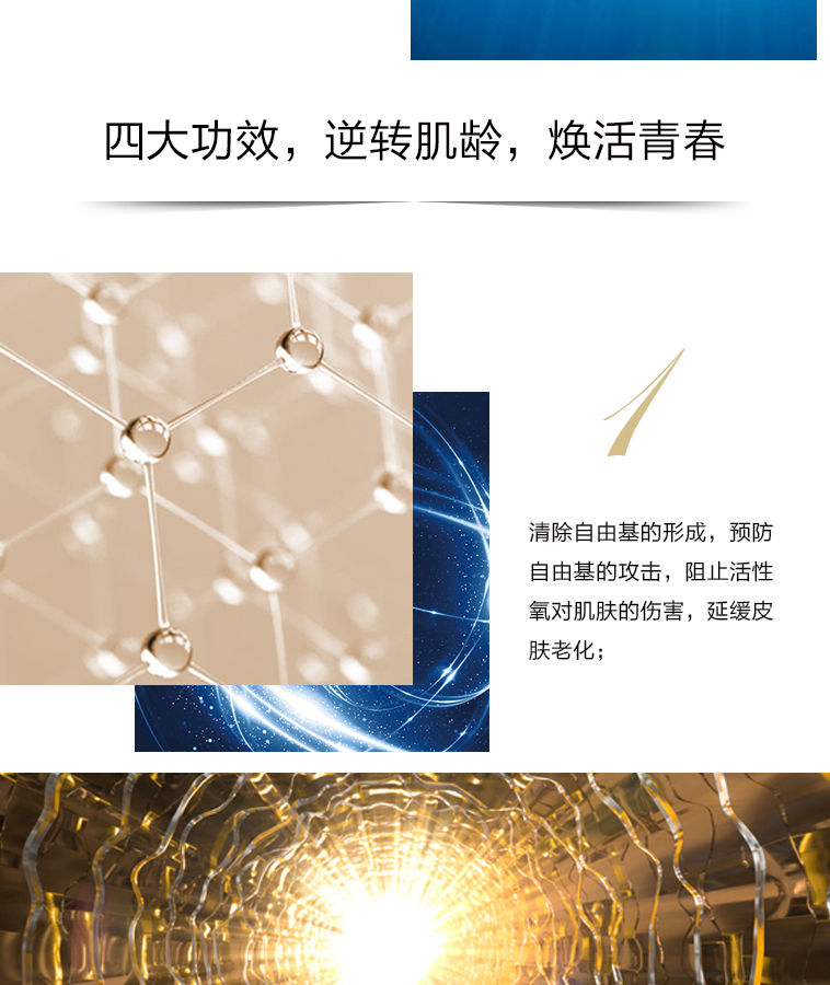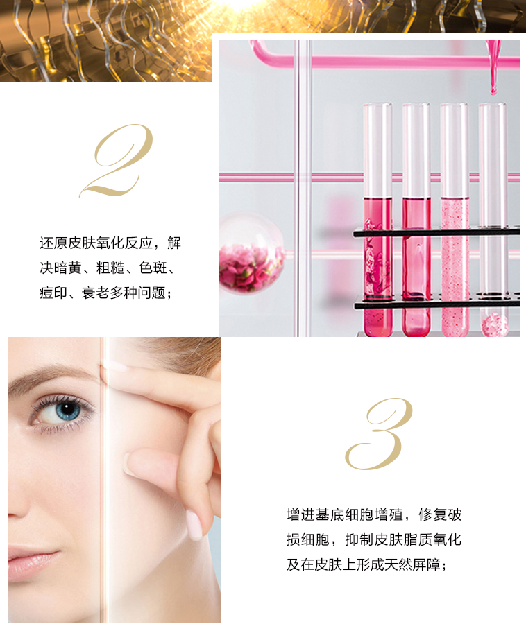 • 功效:1、清除自由基的形成,预防自由基的攻击,阻止活性氧对肌肤的伤害,延缓皮肤老化; 2、还原皮肤氧化反应,解决暗黄、粗糙、色斑、痘印、衰老多种问题; 3、增进基底细胞增殖,修复破损细胞,抑制皮肤脂质氧化及在皮肤上形成天然屏障; 4、改善皮肤的新陈代谢、减少皮肤水分的流失及降低皮肤表面水分的蒸发,令皮肤回复青春活力。
