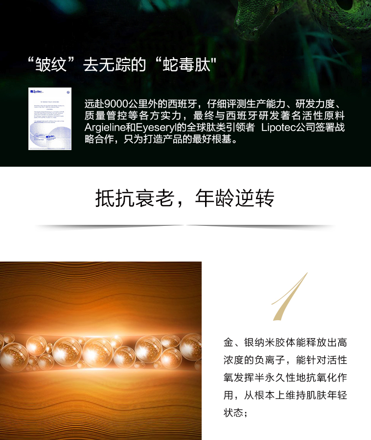 • 成分:金、银、富勒烯、积雪草提取物、海星枝管藻提取物、二肽二氨基丁酰苄基酰胺二乙酸盐(蛇毒肽)